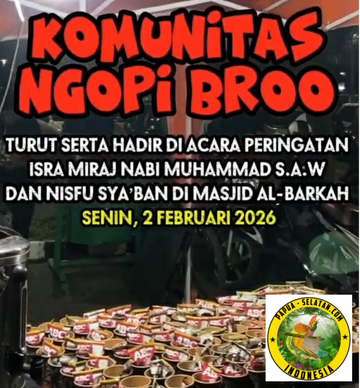 Komunitas Kopi Broo turut ambil bagian dalam memeriahkan peringatan Isra Mi’raj Nabi Muhammad SAW dan Nisfu Sya’ban 1447 Hijriah yang digelar di Masjid Al Barkah, Kota Bekasi, Senin malam (2/2/2026).